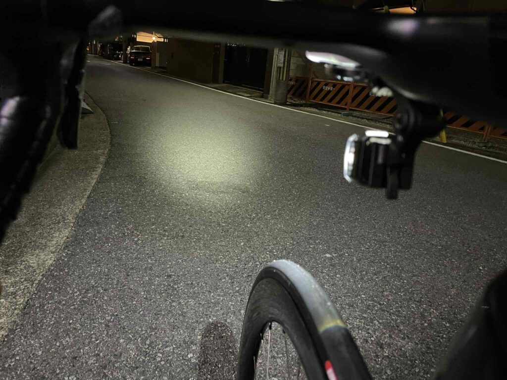 最大モード(100ルーメン)は連続点灯で1.25時間と長くは持ちませんが、こんな感じでしっかり明るいです。